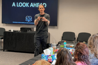 Ava Health CEO Christopher Bennett addresses a group of nearly two-dozen new employees on Jan. 28, which was the third day of a two-week orientation for the new hires, getting them ready for Ava Health to open Feb. 9. One of the things Bennett told the group was: “We will be the most accountable organization that exists in healthcare.” He added, “You are hired here to be trusted, not micromanaged.” Photo by Tim Harty.
