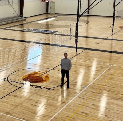 Blackout Board President Dean Havlik stands in the middle of the court for a photo taken from the upper-level section in the middle of Blackout Sports Fieldhouse. Photo by Tim Harty.