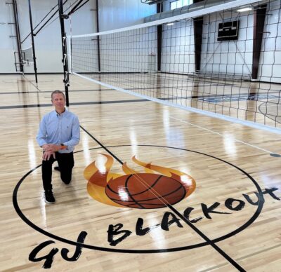 Dean Havlik, who founded the nonprofit GJ Blackout basketball club in 2011 when it was just one eighth-grade girls basketball team, kneels on the midcourt logo on one of the Blackout Sports Fieldhouse courts, which accommodate basketball, volleyball and pickleball. GJ Blackout now has about 600 girls and boys in its club. The Mesa Juniors Volleyball Club joined GJ Blackout as a partner in the fieldhouse project. Havlik said he’d like to see the skills of basketball and volleyball players in the Grand Valley rise to the level that yields state championships for the Grand Valley’s high schools. “That’s always been my thought,” Havlik said. “It’s like, ‘Boy, it would be great if one of our high schools would win the state championship one of these days.’ I don’t care which one it is. I’m pretty equal to all the high schools here.”