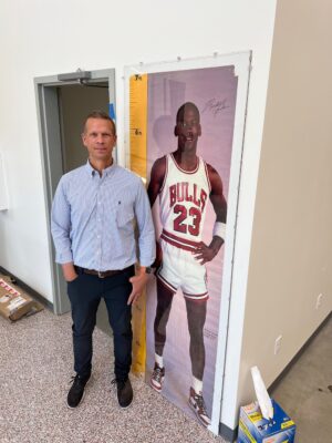 Havlik stands next to a life-size poster of NBA Hall-of-Famer Michael Jordan. The poster was one of many that adorned the walls in Havlik’s bedroom as a teenager, and he is posting some of them inside Blackout Sports Fieldhouse. Havlik said today’s kids don’t know who most of the players are that he idolized as a teen, so he bought a couple posters of current stars, such as Nikola Jokic of the NBA’s Denver Nuggets and Caitlin Clark of the WNBA’s Indiana Fever. Havlik said the Jordan poster is 42 years old and added: “It’s been through the wars. Don’t look too closely. It’s very vintage; that’s what my wife says, vintage.” Photo by Tim Harty.