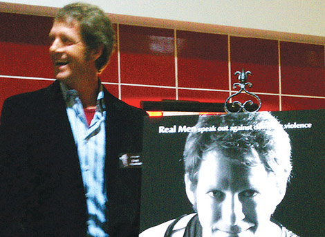 The display is part of the “Real Men Speak Out Against Domestic Violence” campaign.