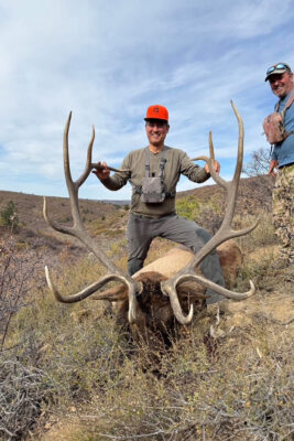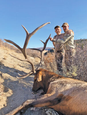 Roosters Guide and Outfitting Services owner Rod Cogburn on the right stands with a bull elk taken by Hunter Andreas during the 2024 season. Photo courtesy of Roosters Guide and Outfitting Adventures.