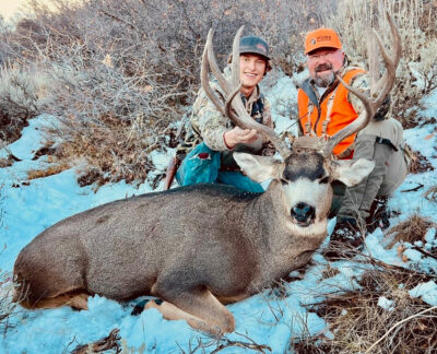 Roosters Guide and Outfitting Services hunting guide Cauy Etcheverry, on the left, and his hunter Danny (no last name provided) pose with a trophy mule deer. Photo courtesy of Roosters Guide and Outfitting Adventures.